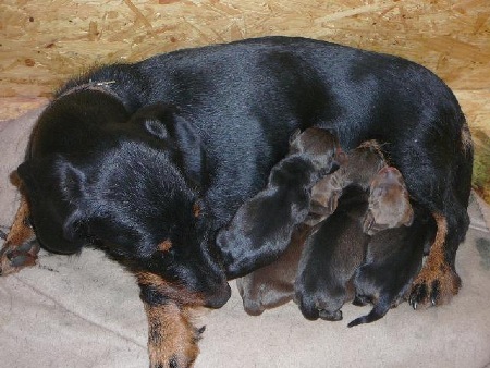 Unsere Rauhaarteckelhündinn Sfk,Sp/J,Wa.T,BhFK/95/J.BHP1u2 Xandra vom Wilstedter Moor hat am 12.10.14 ihren zweiten Wurf bekommen. Es sind drei dunkelsaufarbene Rüden ,eine braune Hündin und eine dunkelsaufarbene Hündin. Xandra wird bei uns auf Nachsuchen und Drück und Treibjagden eingesetzt.Sie ist kinderlieb und verträgt sich auch sehr gut mit anderen Hunden. Auf Der Zuchtausstellung in Einbeck wurde sie mit dem Prädikat "vorzüglich " bewertet